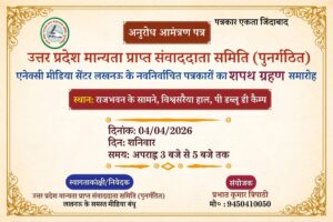लखनऊ। उत्तर प्रदेश मान्यता प्राप्त संवाददाता समिति (पुनर्गठित) के नवनिर्वाचित पत्रकारों का भव्य शपथ ग्रहण समारोह शनिवार, 4 अप्रैल 2026 को आयोजित किया जाएगा। यह कार्यक्रम राजधानी के प्रतिष्ठित विश्वेश्वरैया हॉल (PWD कैंप), राजभवन के सामने संपन्न होगा।